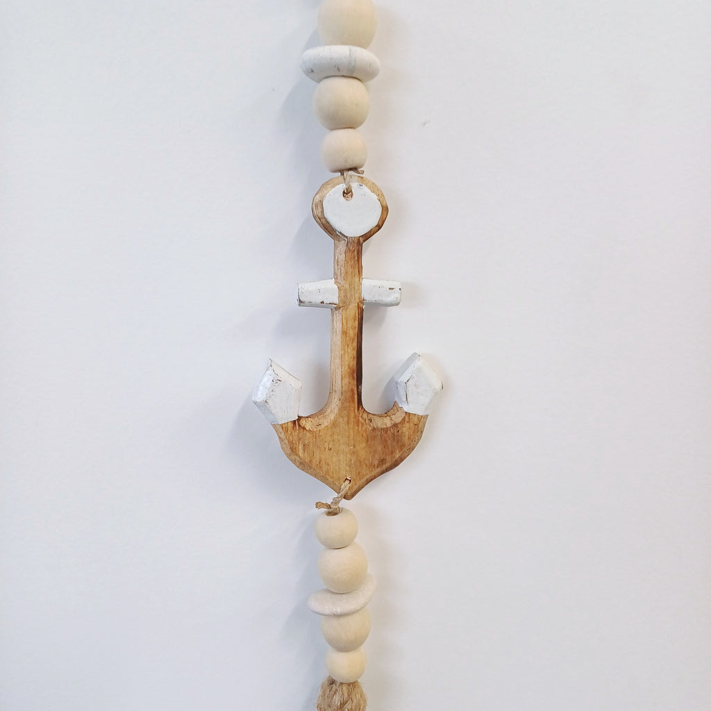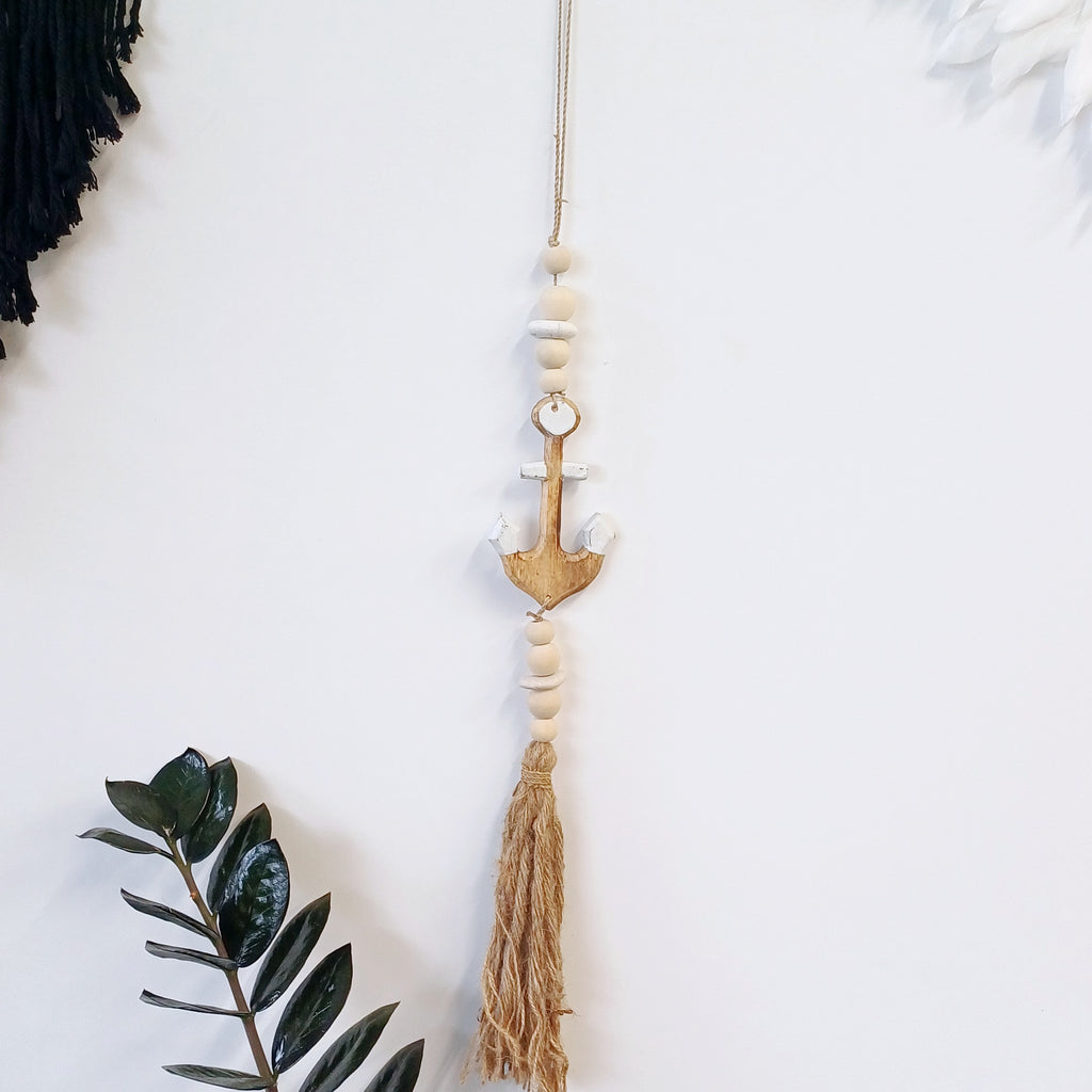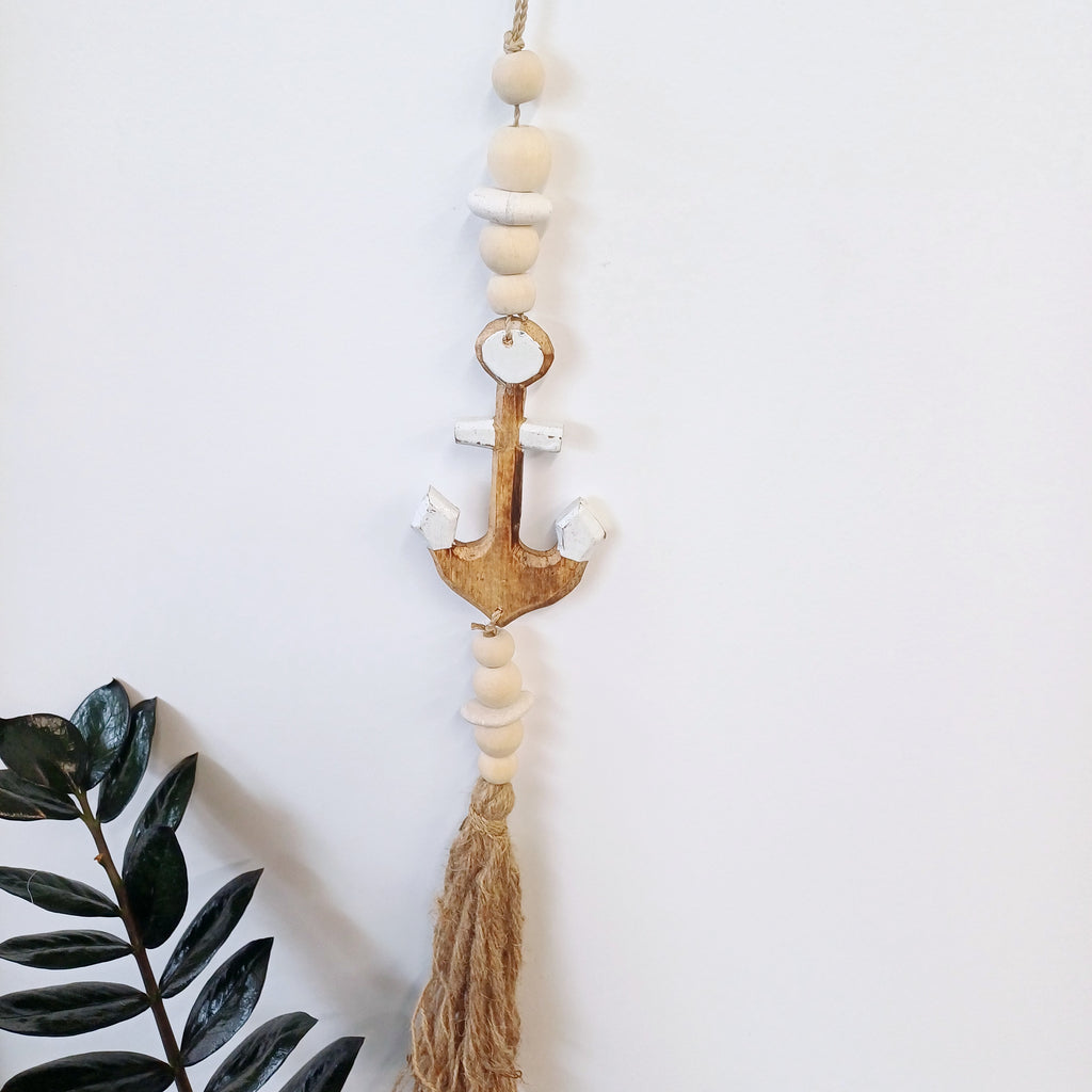 A handcrafted blend of driftwood tones and natural textures, the Anchor Drift Wall Tie features a wooden anchor, natural beads, stone, and raffia tassels.