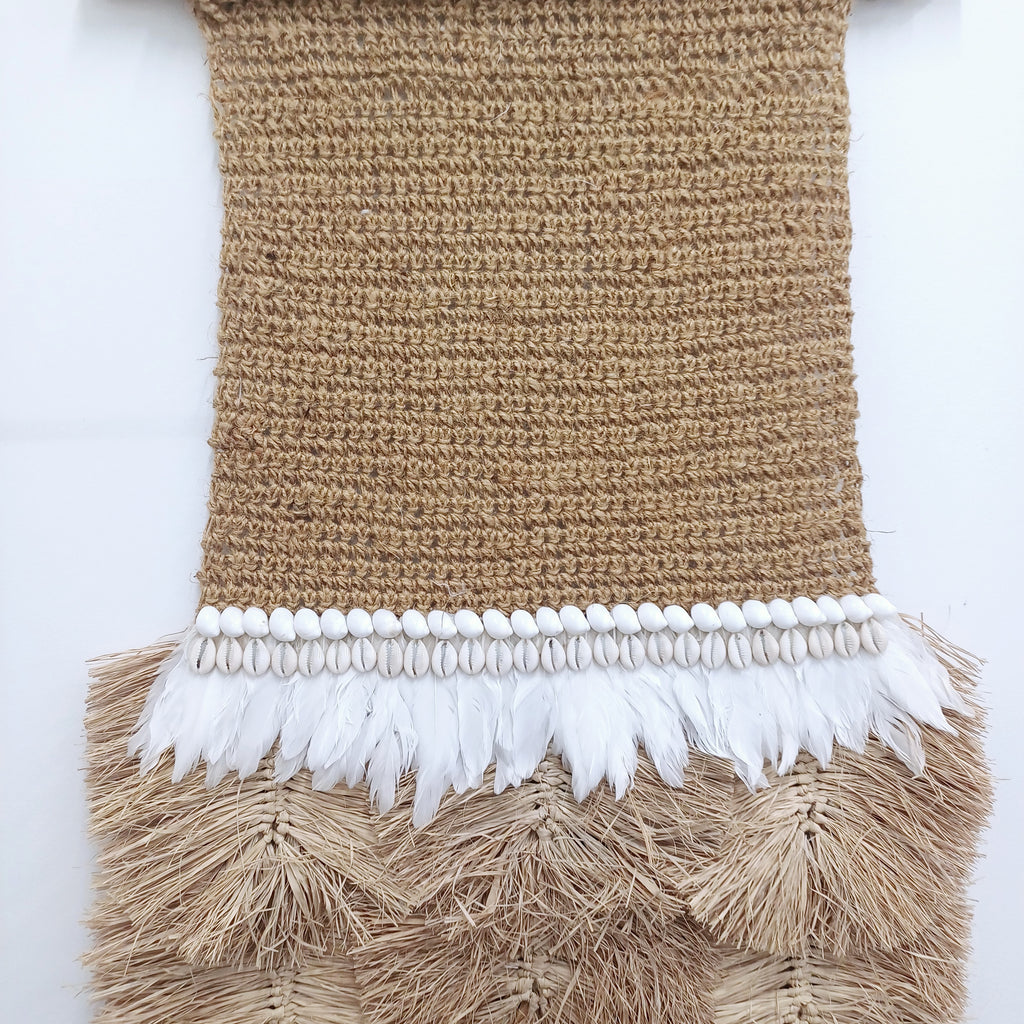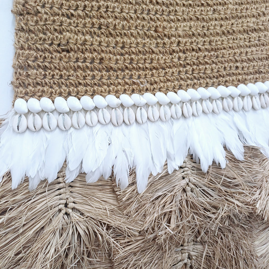 A statement piece that blends natural textures with coastal charm. This handcrafted wall hanging features layers of soft feathers and shell detail, creating movement and warmth for any room.