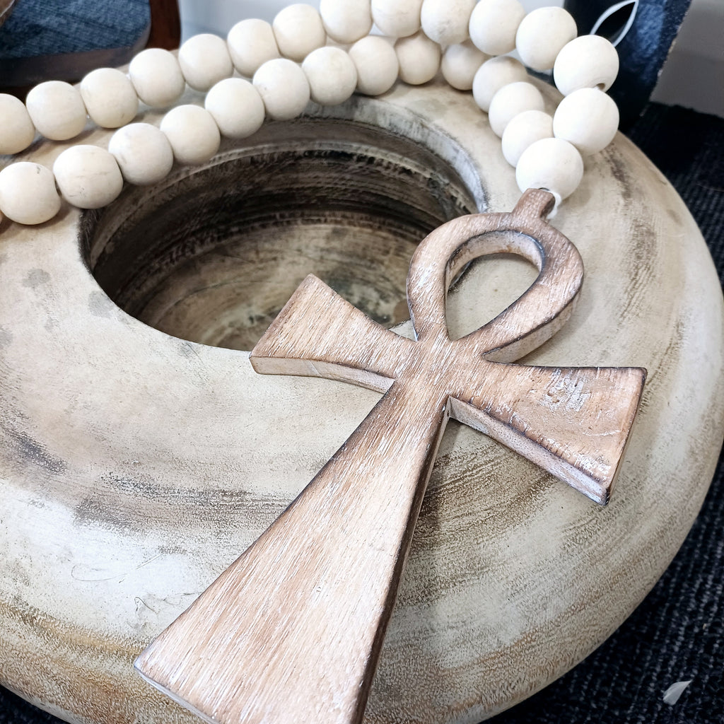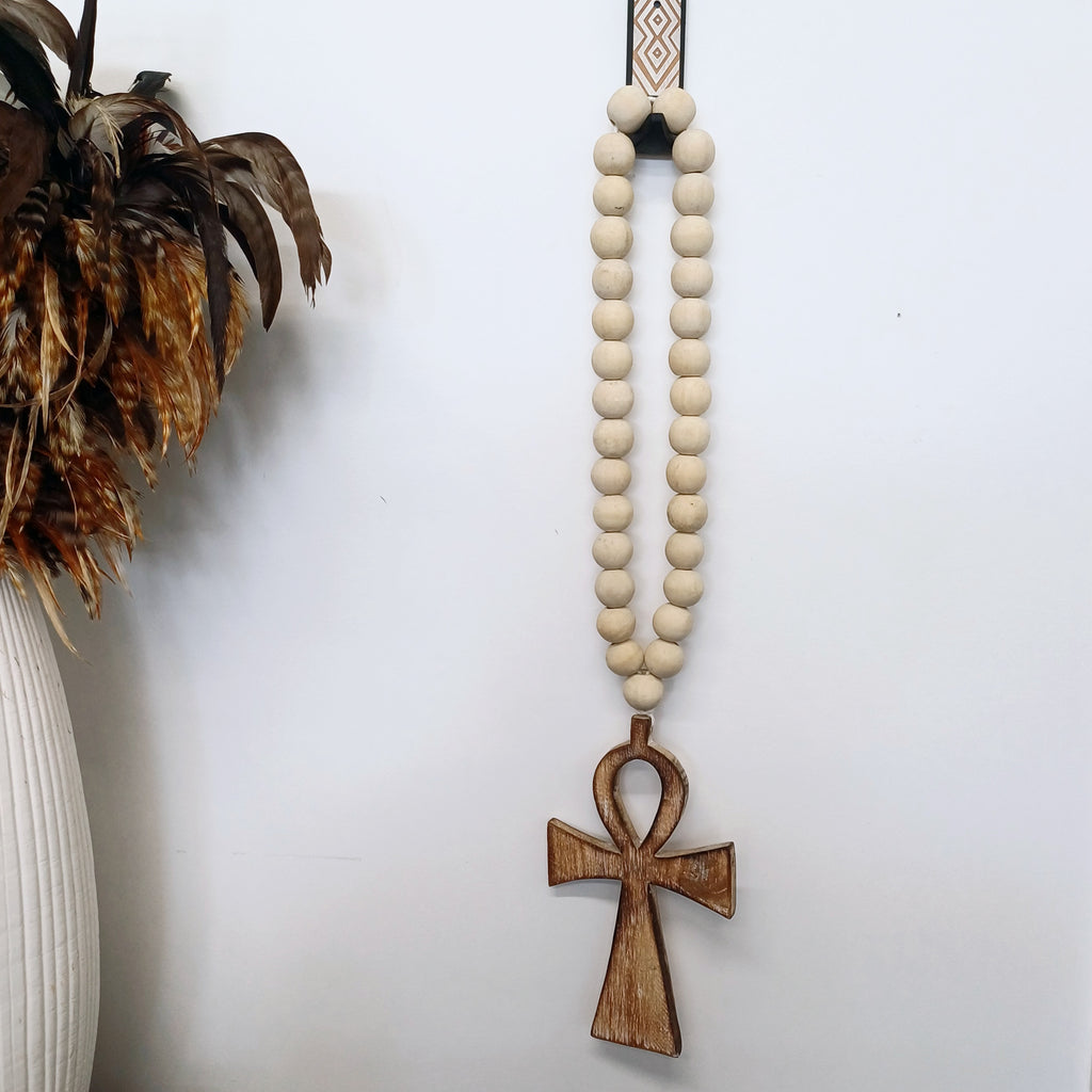 Crafted from natural wood and paired with soft wooden beads, it’s a meaningful piece that works beautifully as part of a gallery wall, over a console, or in a quiet reading nook. The darker wash brings a rich, earthy tone that suits both neutral and moody interiors.