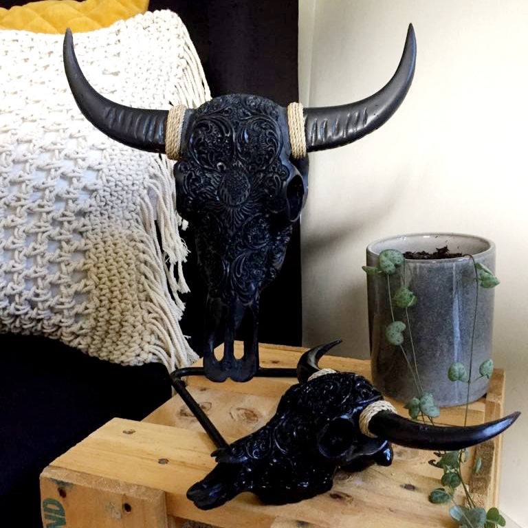 The Large Black Skull is a bold, sculptural accent designed to add depth and modern edge to your space. With its matte black finish and detailed resin design, it’s perfect for boho, western, or contemporary interiors.