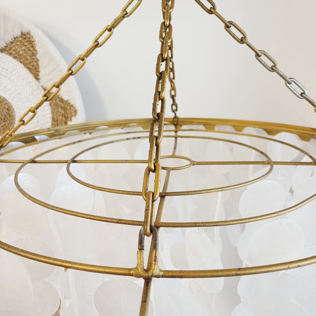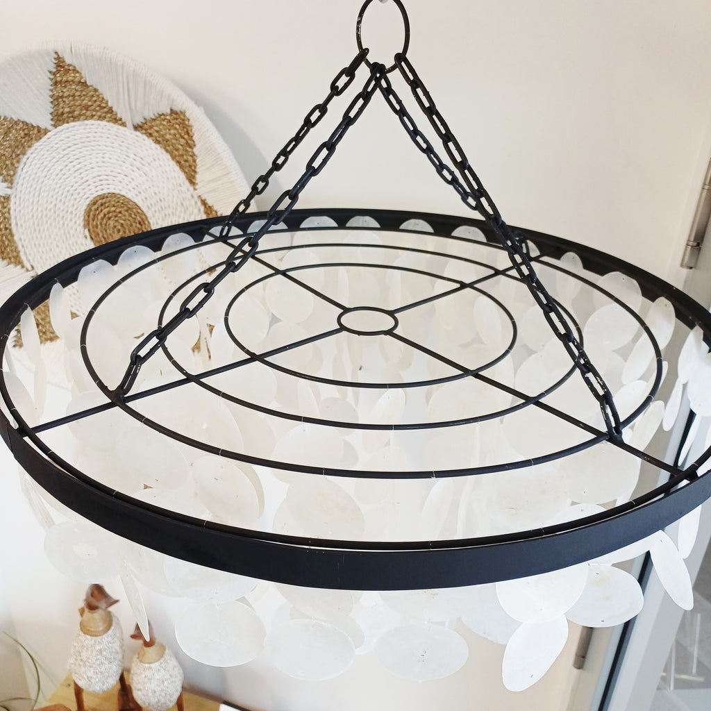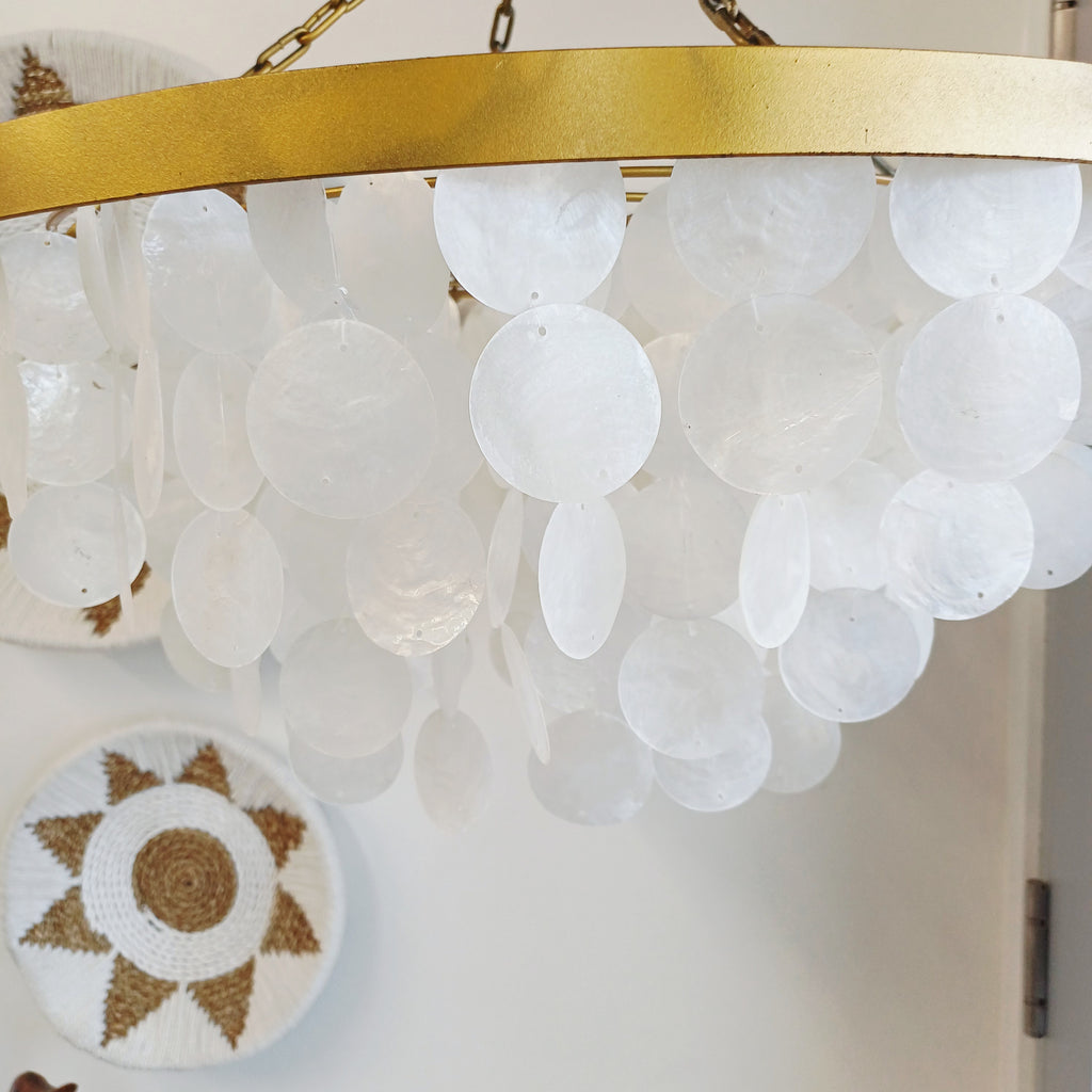 Crafted with shimmering mother-of-pearl accents and a sleek steel frame, this chandelier creates a soft, warm glow that enhances any room. The natural iridescence of the pearl pieces reflects the light beautifully, adding texture, depth, and a gentle shimmer.