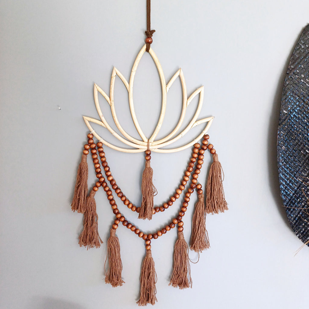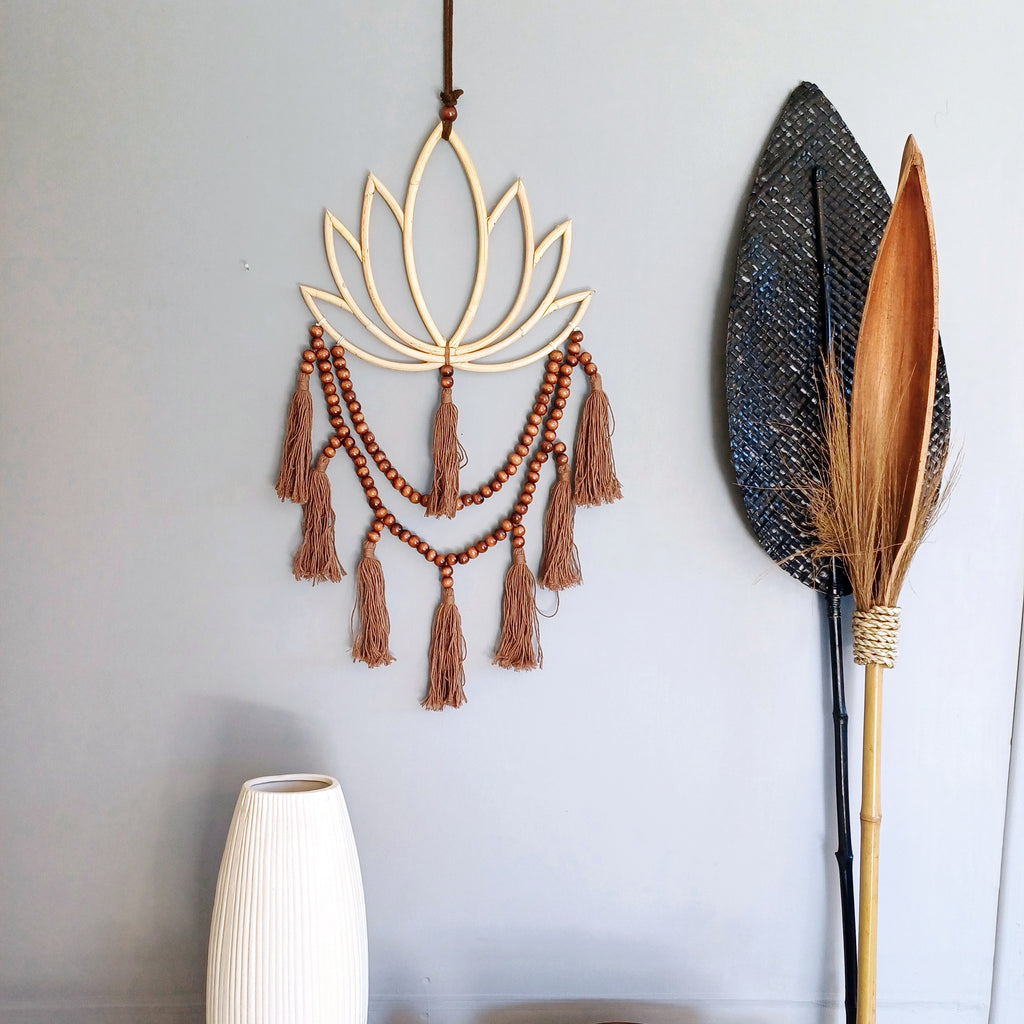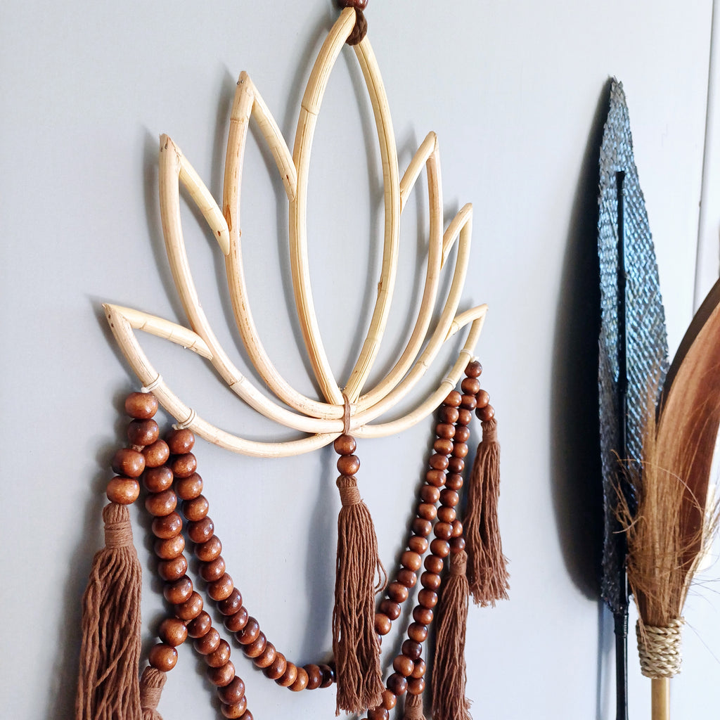 The Lotus Deep Coffee Bead Wall Hanging is a beautifully handcrafted piece, featuring an intricately woven cane lotus flower adorned with rich coffee-toned beads. Designed to bring a sense of warmth, texture, and natural elegance, this wall hanging is perfect for creating a serene and stylish focal point in your home.