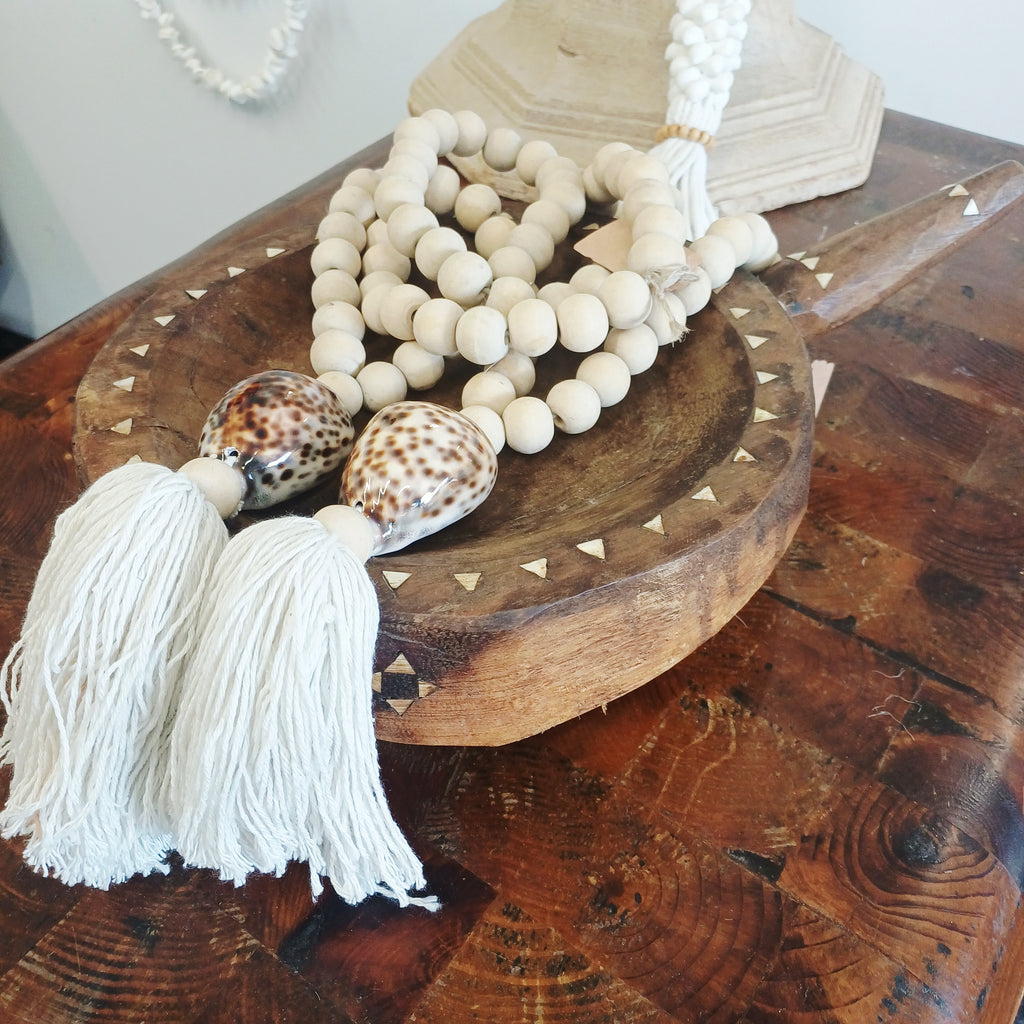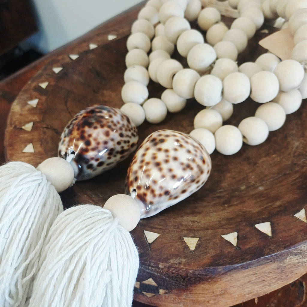 Add a touch of coastal charm and bohemian elegance to your accessories with our Natural Cowrie Shell Tassel. Each tassel is handcrafted using genuine cowrie shells and finished with natural wooden beads.