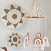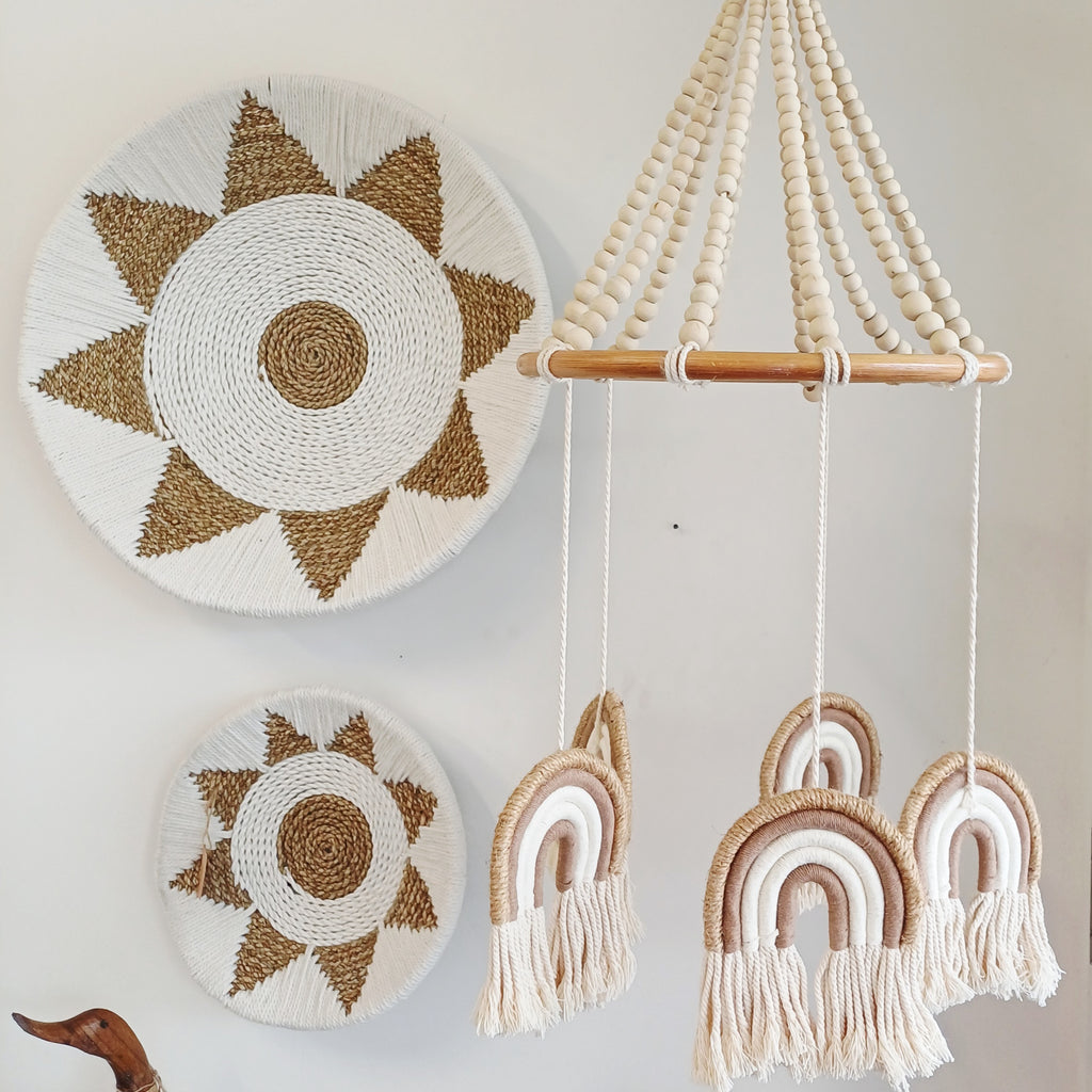 Bring neutral color, texture, and a touch of magic to your little one's room with our Rainbow Mobile. Carefully handcrafted with a mix of Rattan and natural beads, this charming mobile adds a calming element to any nursery or kid’s space.