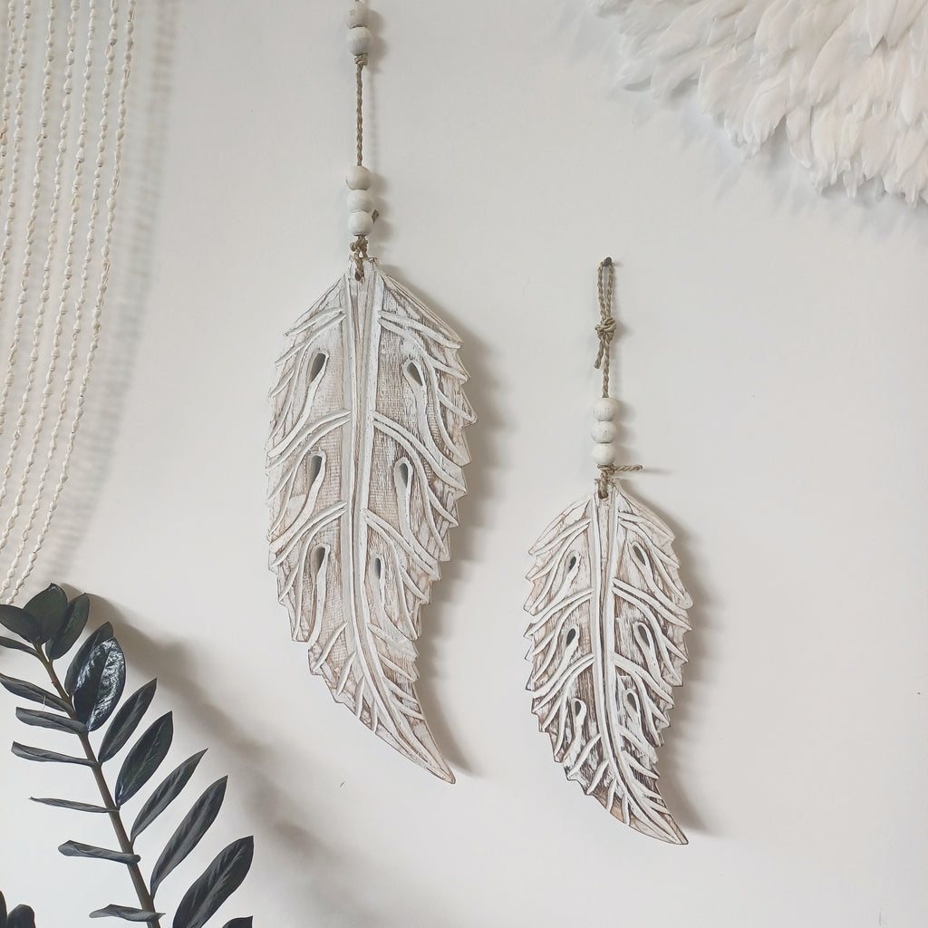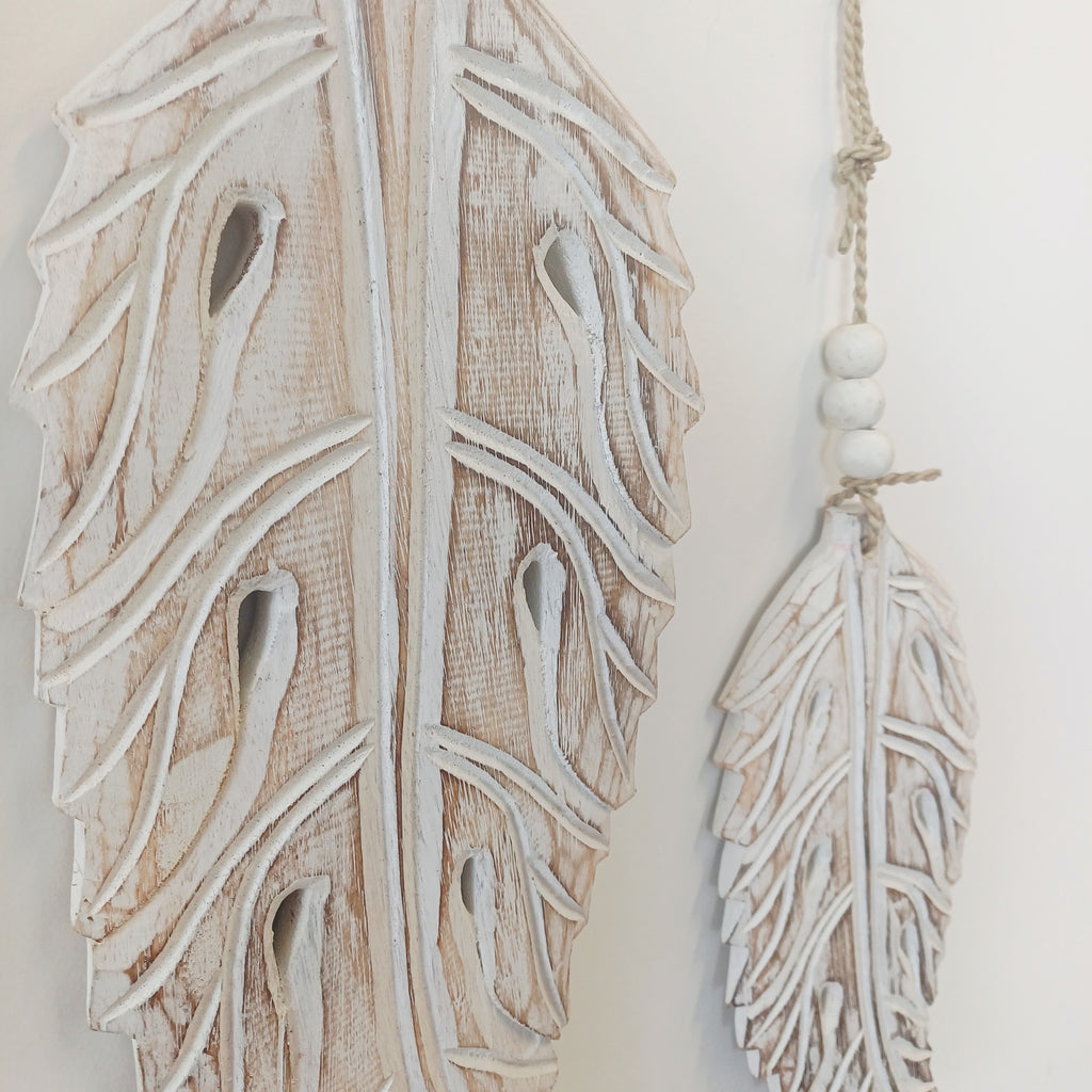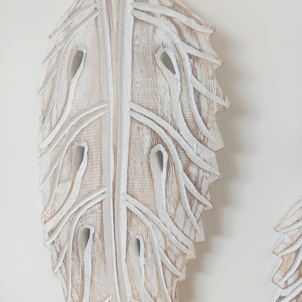 Bring natural charm into your space with these beautifully crafted wooden feathers. Made from lightweight wood and finished with a subtle white wash, each piece showcases unique grain patterns and soft, rustic character.