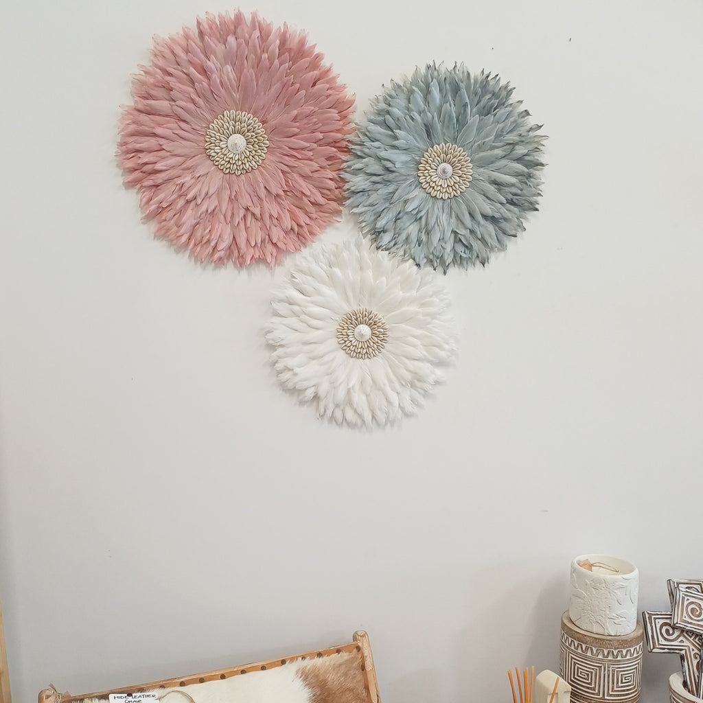Bring rich colour and textured elegance to your interiors with this Mulberry, White & Grey Juju Cluster. Featuring a complementary palette of deep mulberry, soft grey tones, and crisp white, this artisan wall cluster creates a striking focal point that balances bold colour with soothing neutrals — perfect for modern, boho, or eclectic spaces.