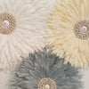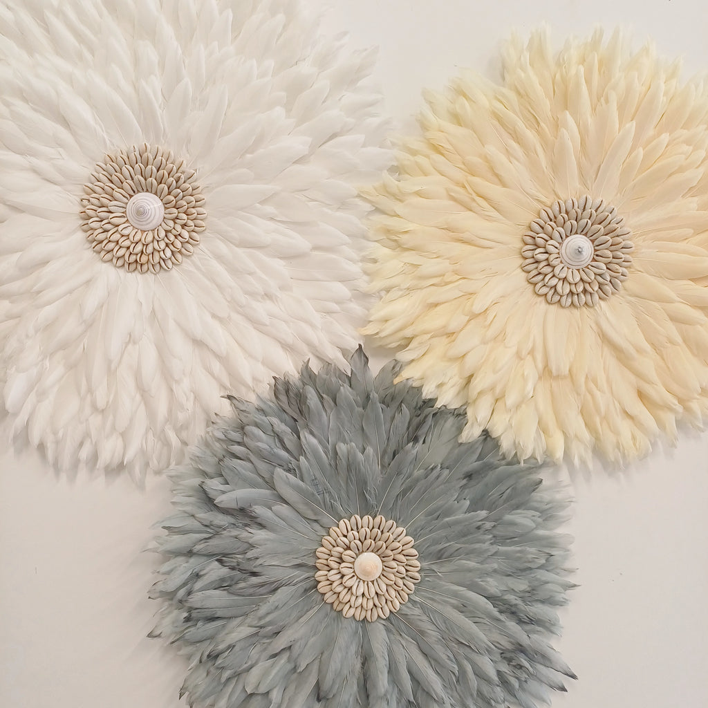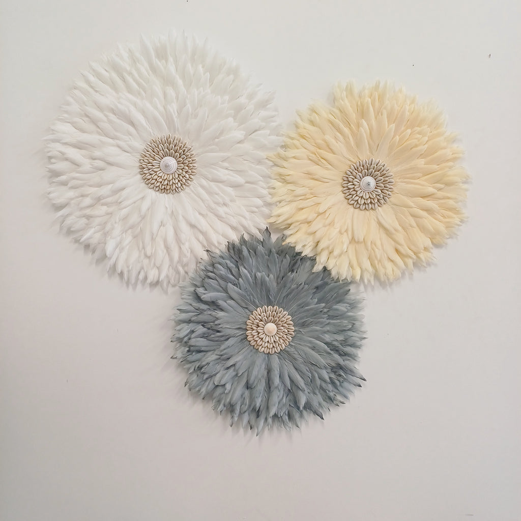 Bring effortless beauty and soft colour into your space with the Lemon Mist Feather Wall Cluster. Featuring a soothing trio of handcrafted juju wall hangings in complementary tones — crisp white, lemon sorbet, and soft grey — this one-off cluster is perfect for bedrooms, nurseries, living spaces or hallways.