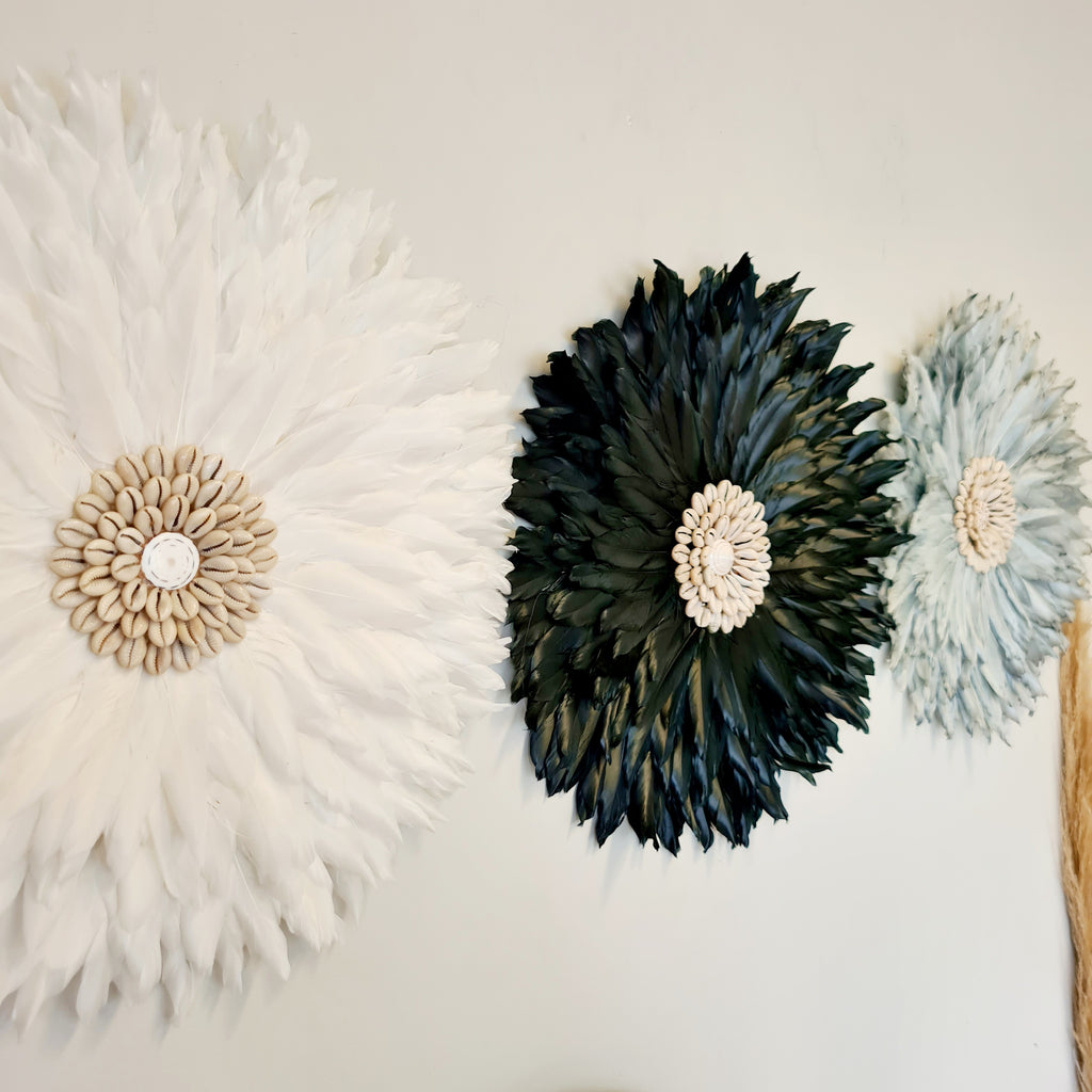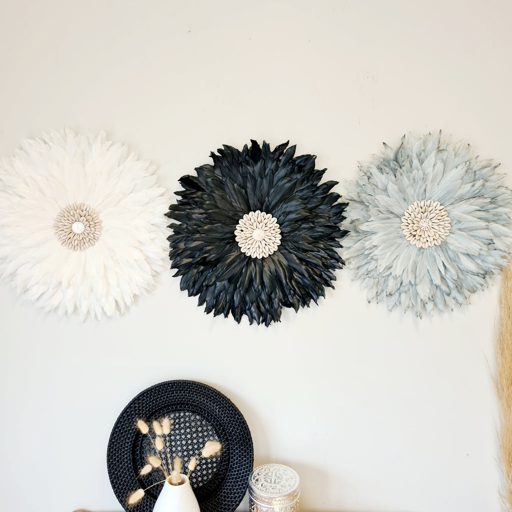 The Small Classic Black, White & Grey Juju Cluster is a timeless and stunning combination of White, Black, and Grey tones. This carefully crafted cluster is a perfect match for any space, offering a sophisticated and balanced look that will always be a standout feature in your home. Handcrafted with attention to detail, each piece in this cluster adds depth and contrast, making it a must-have for modern and boho-inspired interiors. The Classic BWG will bring a perfect blend of elegance and warmth to your walls.