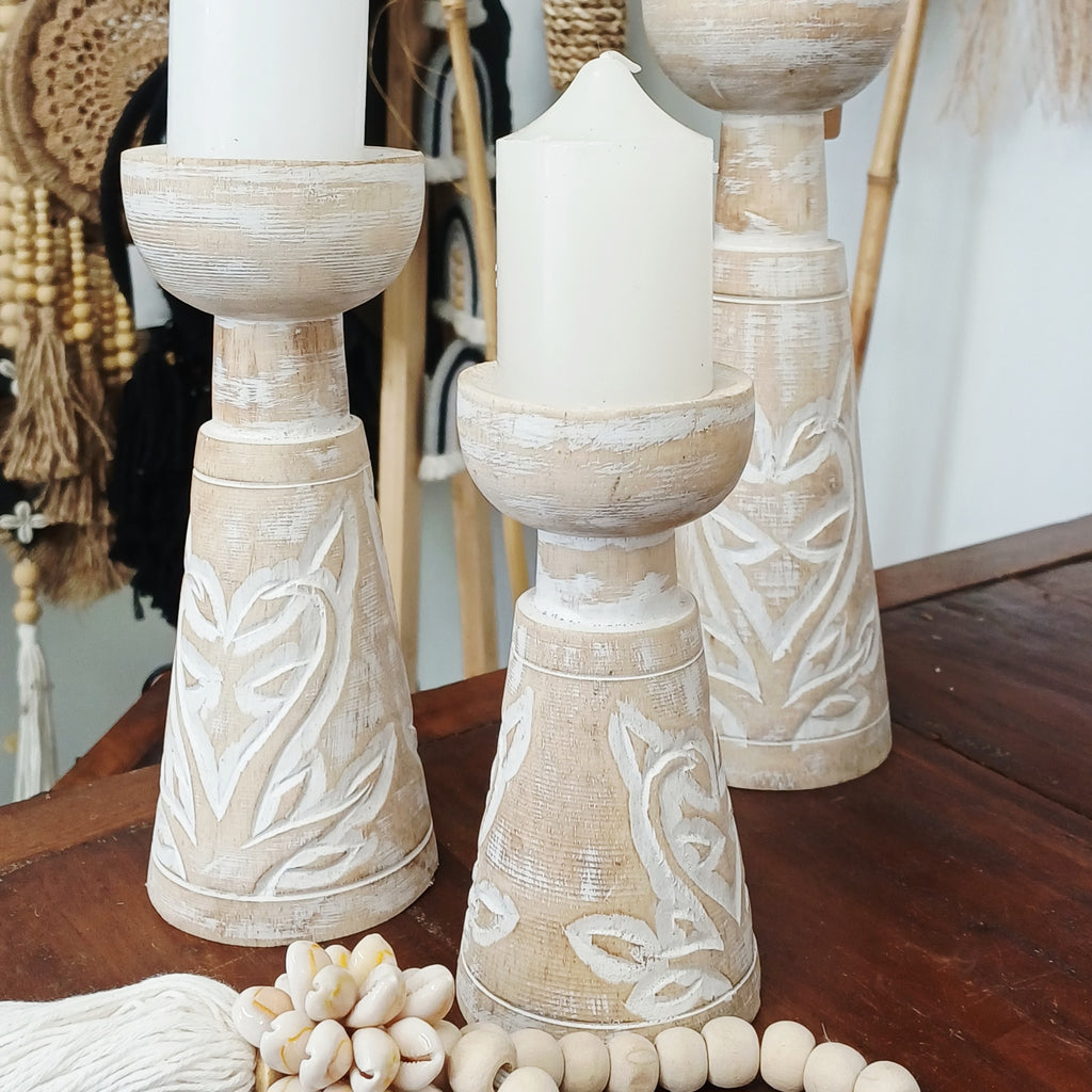 Create a warm, relaxed ambience with this beautiful set of three carved coastal wooden candle holders. Handcrafted with intricate detailing, each piece showcases whitewashed the wood, bringing texture and organic charm to your décor.