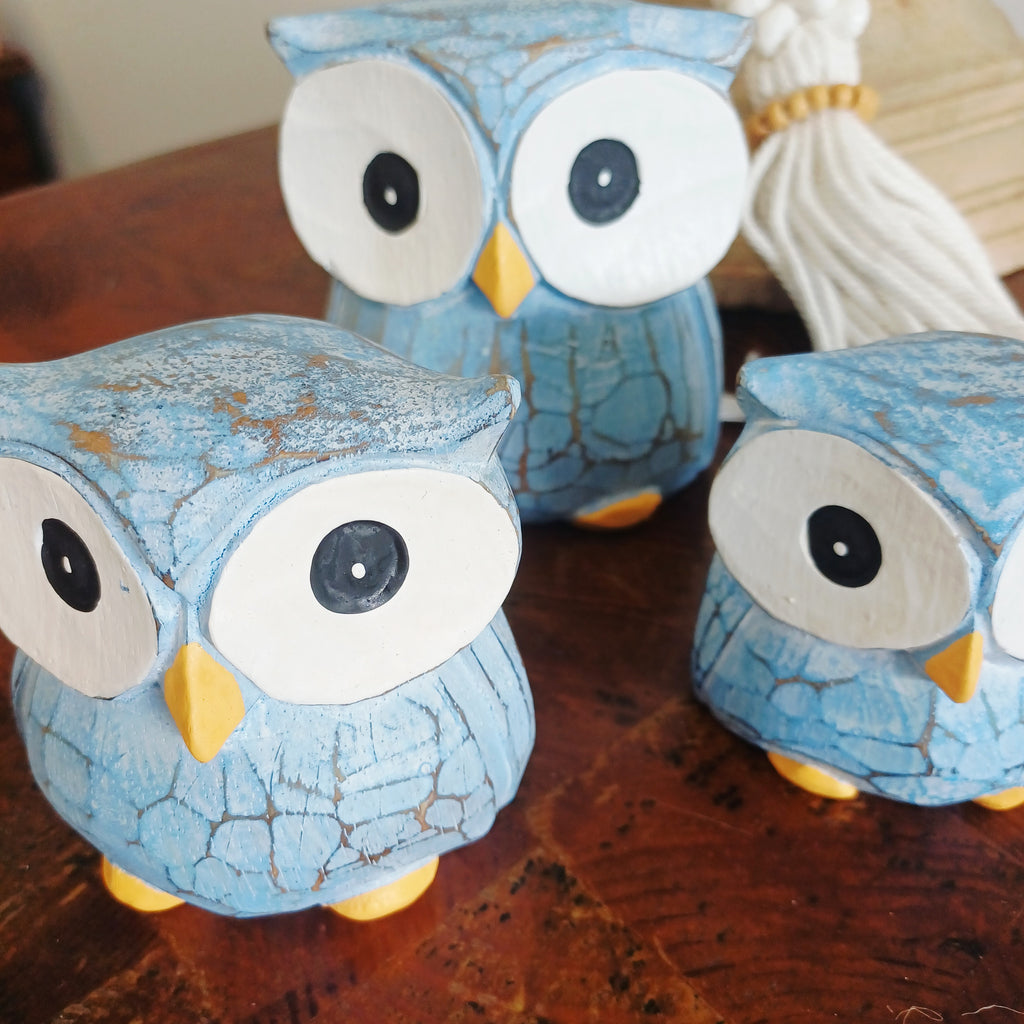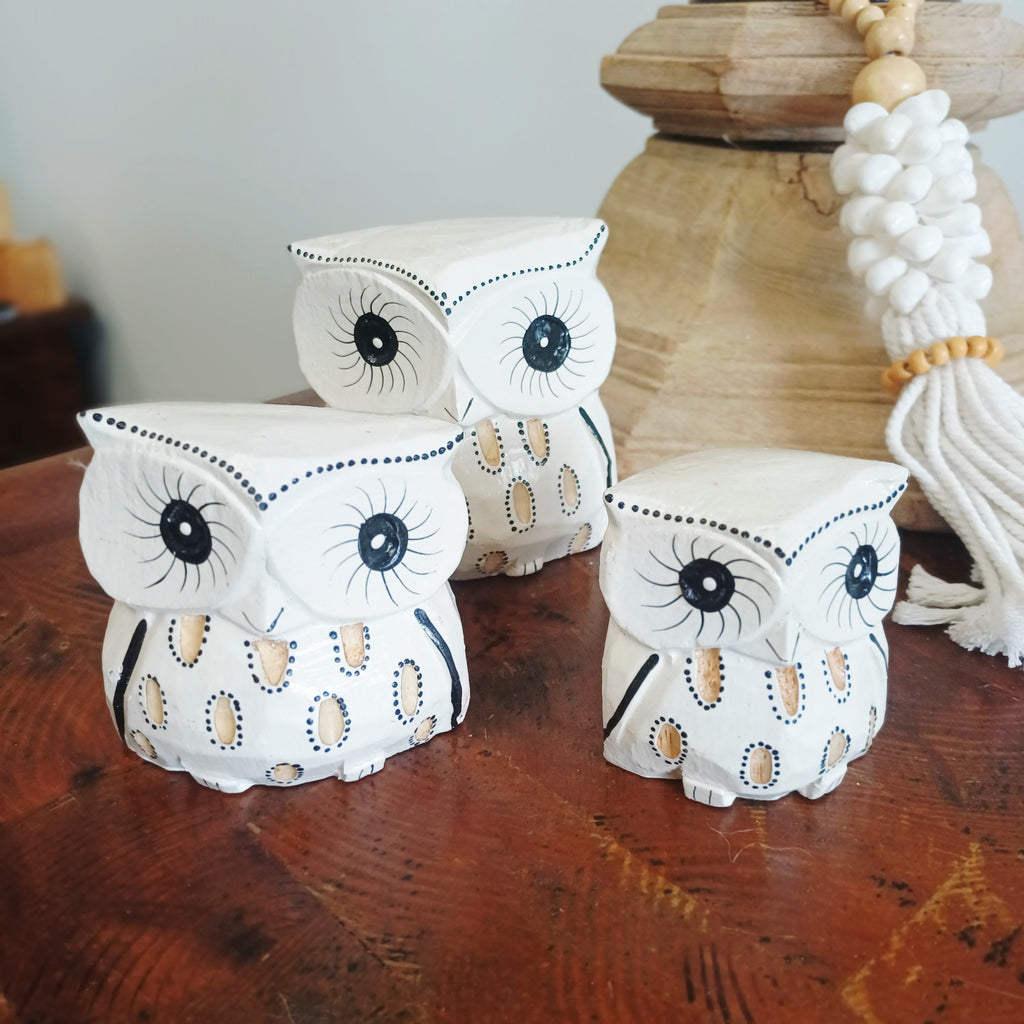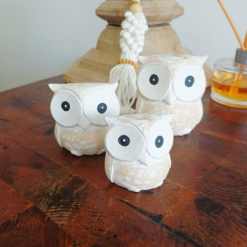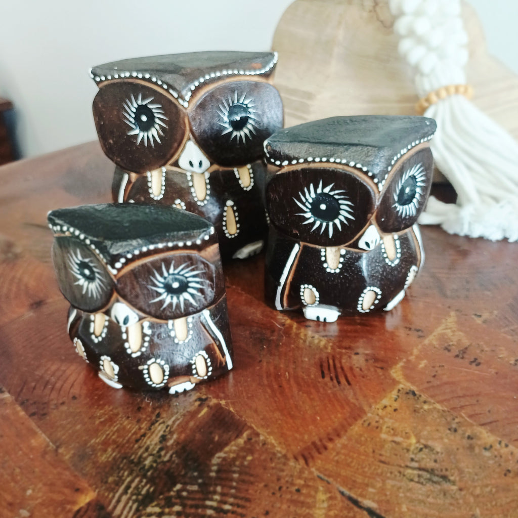 Bring character and warmth into your home with this charming Set of 3 Wooden Owls. Each owl is hand-carved from natural timber and features expressive detailing, soft carving lines, and unique grain patterns that give every piece its own personality. The rustic finish and organic texture make them a sweet addition to any space.