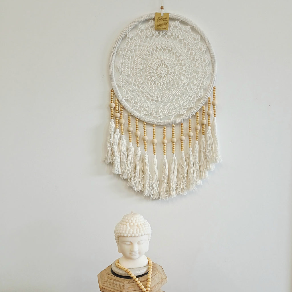 Create a calming atmosphere in your home with our Circle of Serenity Dreamcatcher. Designed to embody harmony and tranquility, this handcrafted piece features a soft circular weave, delicate trailing strands, and subtle beaded accents that bring a soothing, airy presence to any space. The natural textures and gentle movement give it a peaceful look that suits relaxed, earthy, and boho-inspired interiors.