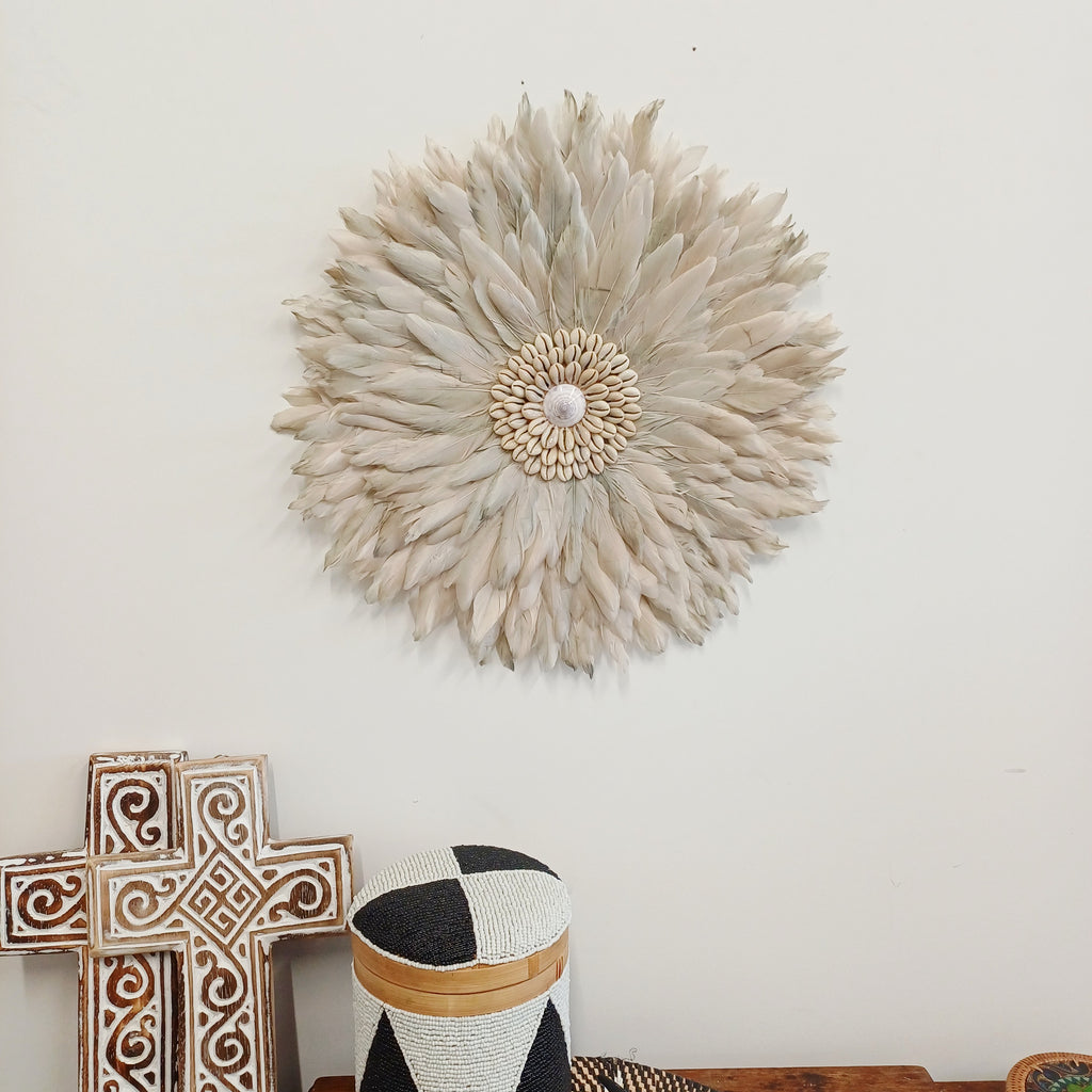 Handcrafted with layers of soft feathers in aged pearl and muted dusky tones, this Juju carries subtle hints of mauve that give it incredible depth and texture. Its understated beauty makes it an effortless way to bring character and warmth into any space.