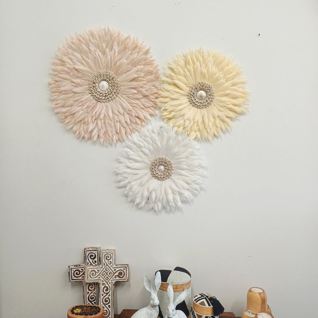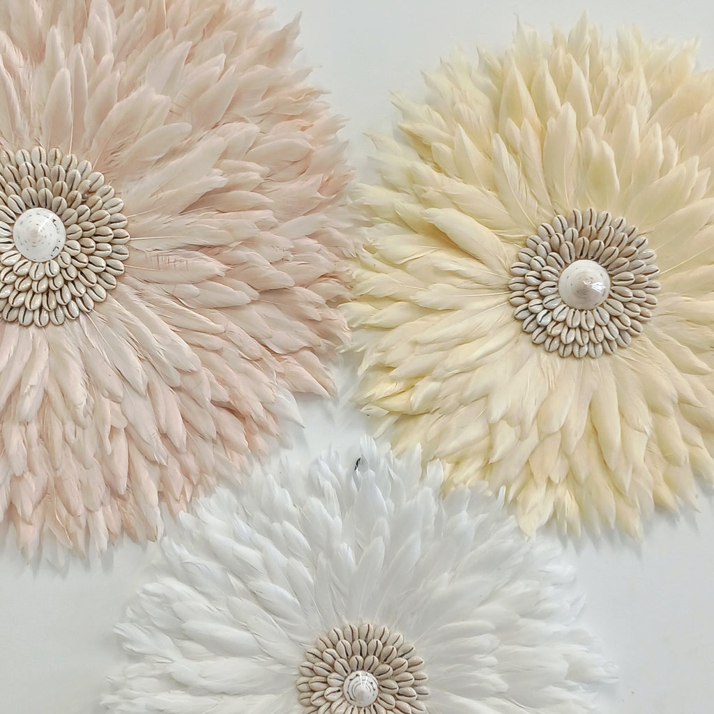 Each Juju is handcrafted from natural feathers, offering a stunning mix of texture and gentle movement. Styled above a console, in a nursery, living room, or bedroom, this cluster adds a calm coastal glow that fits effortlessly into boho, modern, or neutral interiors.