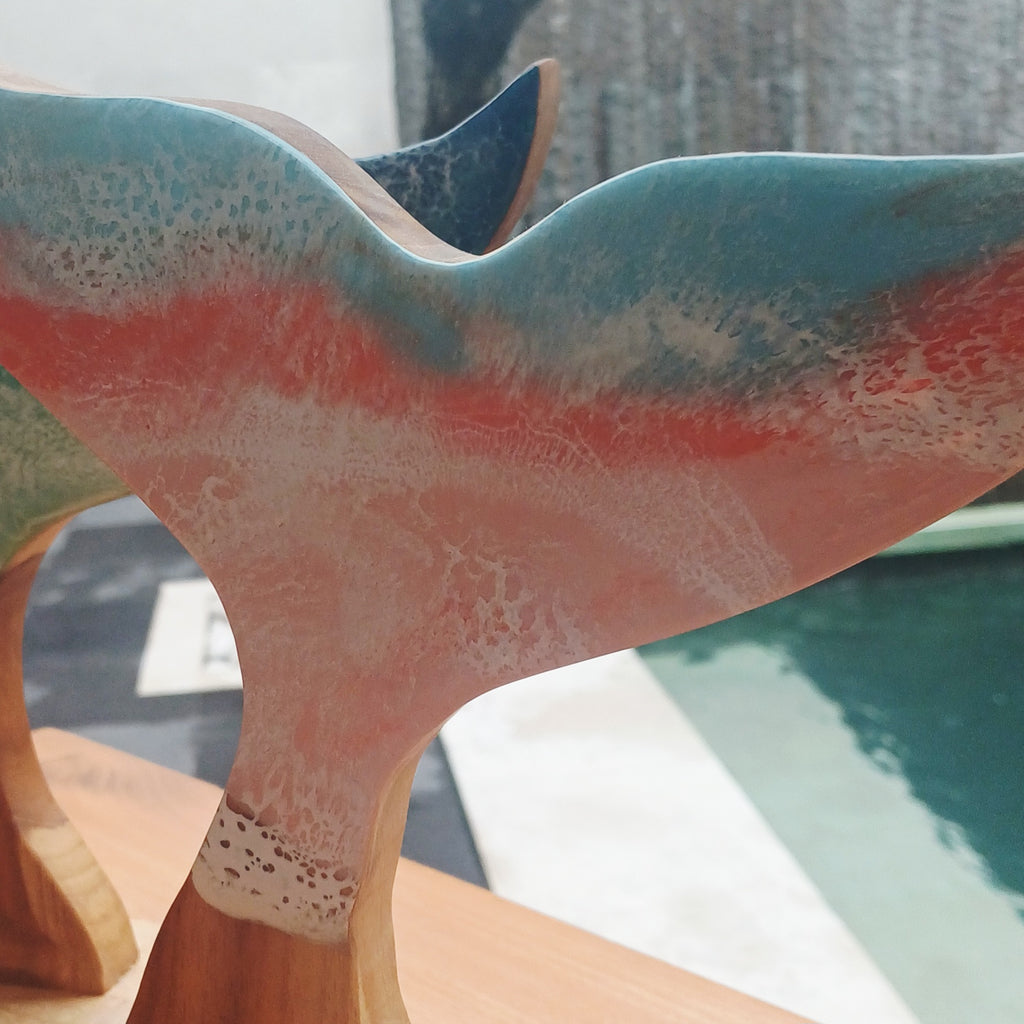 Celebrate the beauty of the ocean with our Teak and Resin Whale Fluke décor piece. Crafted from rich, warm teak and paired with smooth, translucent resin, this sculpture captures the graceful movement of a diving whale in a modern, coastal way. The contrast between the natural wood grain and the glossy resin creates a striking blend of organic texture and contemporary design.
