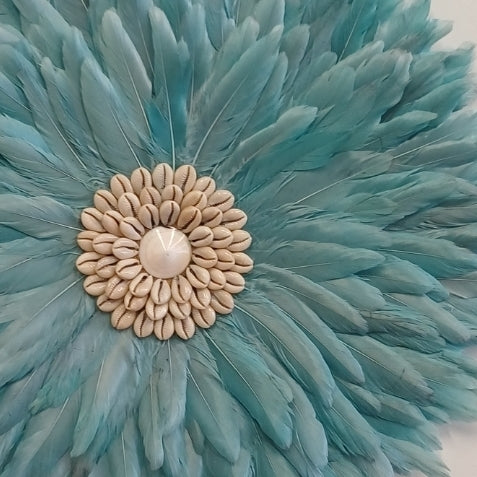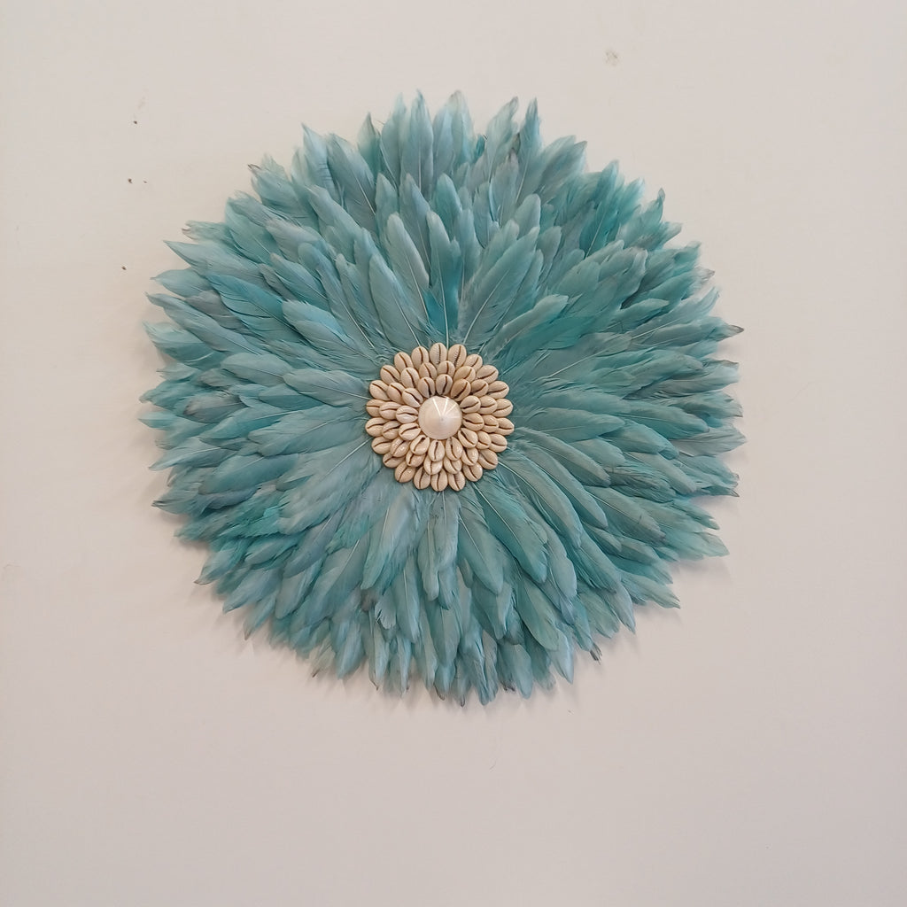 Featuring soft, layered feathers in a calming aquamarine hue, this piece symbolizes peace, protection, and inner clarity—perfect for creating a tranquil atmosphere in your home, Whether displayed solo or as part of a cluster the Small Juju offers a striking yet subtle visual impact.